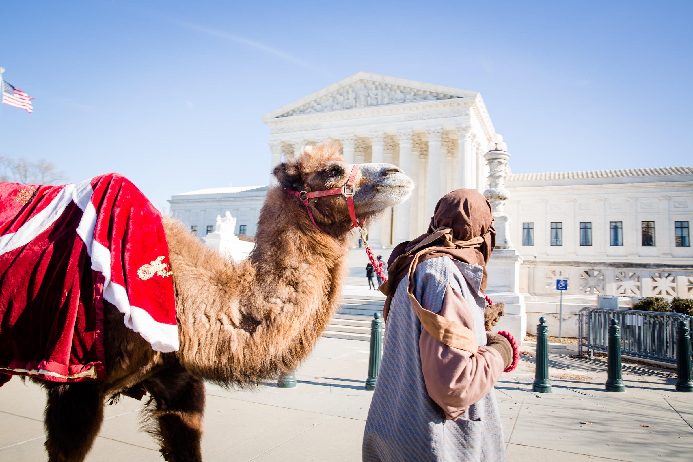 An actor leads a camel past the U.S. Supreme Court during a live nativity procession in Washington, D.C., on December 13, 2017. (Erin Schaff/UPI/Alamy)