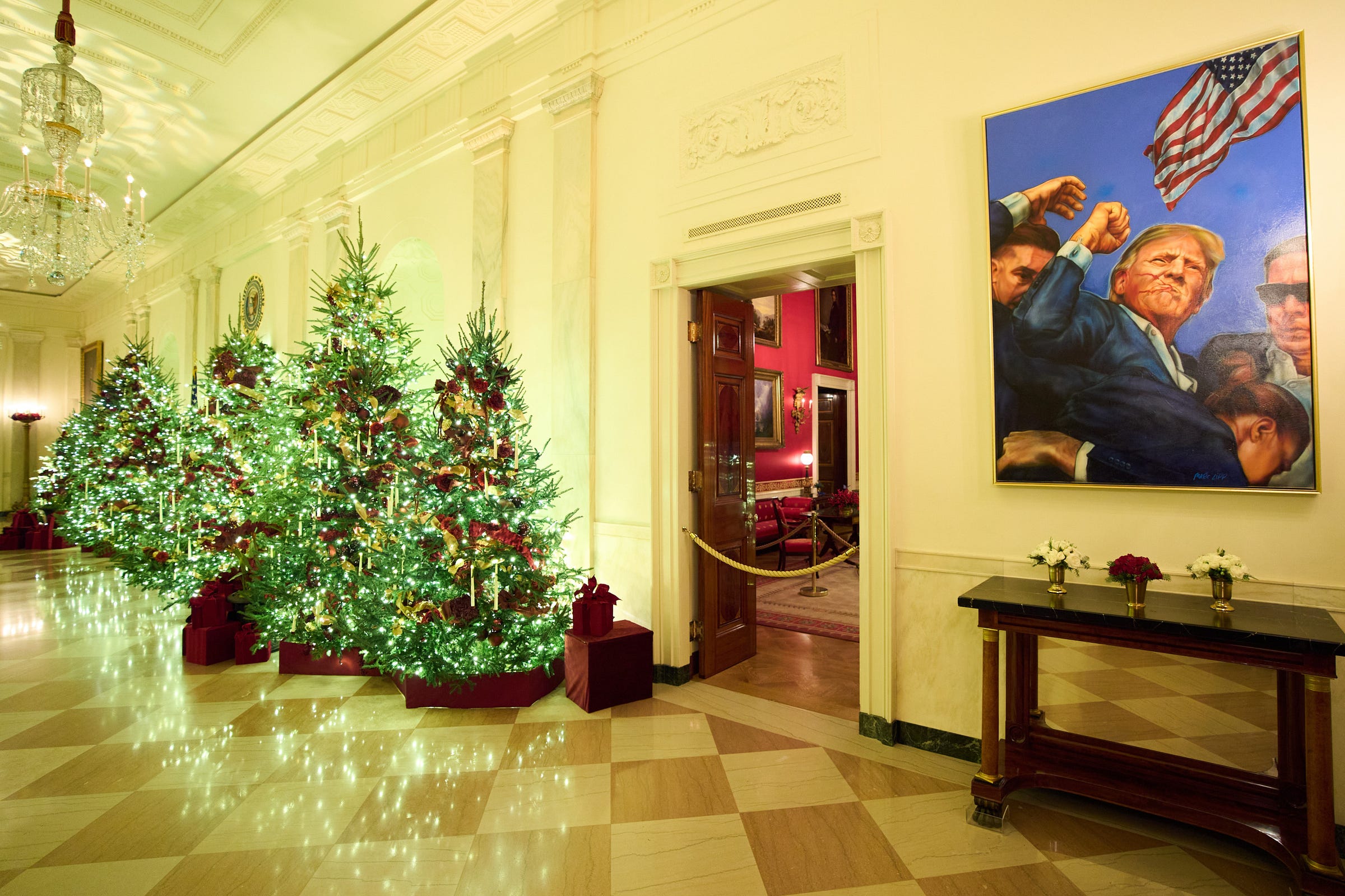 Christmas trees decorate the Cross Hall of the White House on Dec. 1, 2025. (Evan Vucci/Associated Press)