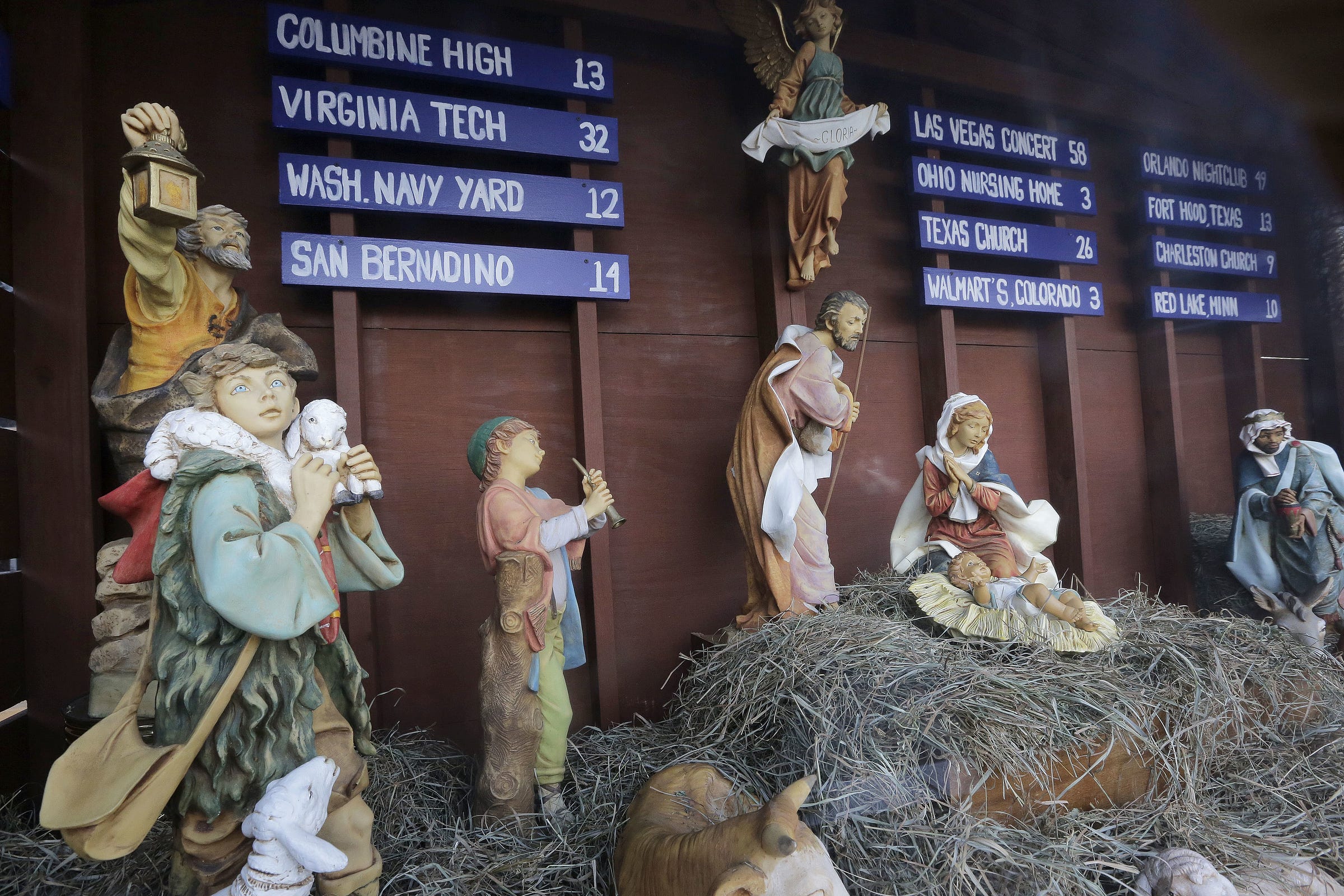 A Nativity scene in front of Saint Susanna Parish in Dedham, Massachusetts, on Dec. 7, 2017, that also includes signs listing U.S. mass shootings and the number of people killed at each in order to call attention to gun violence. (Steven Senne/Associated Press)